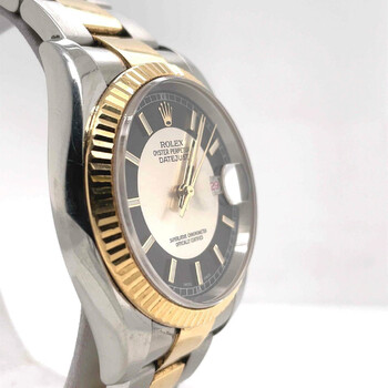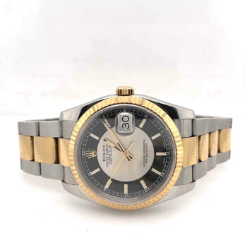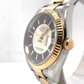 Pre-owned Stainless steel and 18k yellow gold case with a stainless steel and 18k yellow gold rolex oyster bracelet. Fixed - fluted 18k yellow gold bezel. Silver and black dial with yellow gold-tone hands and luminous stick hour markers. Dial Type: Analog. Date display at the 3 o'clock position. Automatic movement. Scratch resistant sapphire crystal. Case diameter: 36 mm. Round case shape. Water resistant at 100 meters / 330 feet. Functions: date, hour, minute, second. Luxury watch style. Watch label: Swiss Made. Rolex Oyster Perpetual Datejust 36 Silver and black Dial Stainless Steel and 18K Yellow Gold Rolex Oyster Automatic Men's Watch 116233BKSSO.