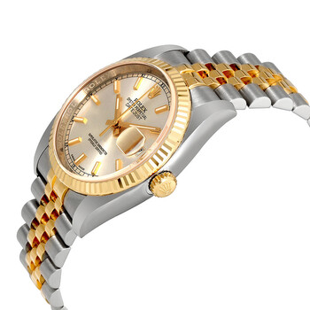 Stainless steel case with a stainless steel Rolex jubilee bracelet with 18kt yellow gold center links. Fixed fluted 18kt yellow gold bezel. Silver dial with yellow gold-tone hands and index hour markers. Minute markers around the outer rim. Dial Type: Analog. Luminescent hands and dial markers. Date display at the 3 o'clock position. Rolex calibre 3135 automatic movement with a 50-hour power reserve. Scratch resistant sapphire crystal. Screw down crown. Solid case back. Case size: 36 mm. Round case shape. Hidden deployment clasp. Water resistant at 100 meters / 330 feet. Functions: date, hour, minute, second, chronometer. Additional Info: date displays at 3 o'clock position. Luxury watch style. Watch label: Swiss Made. Item Variations: 116233-63603. Rolex Oyster Perpetual Datejust 36 Silver Dial Stainless Steel and 18K Yellow Gold Rolex Jubilee Automatic Men's Watch 116233SSJ.