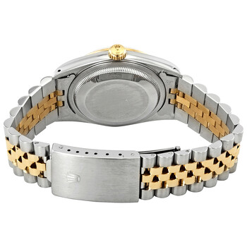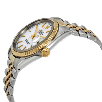 Silver-tone stainless steel case with a two-tone (silver-tone and gold-tone) stainless steel and 18k yellow gold bracelet. 18k yellow gold fluted bezel gold-tone 18k yellow gold bezel. White dial with gold-tone hands and index hour markers. Minute markers around the outer rim. Dial Type: Analog. Luminescent hands and markers. Date display at the 3 o'clock position. Rolex Calibre 3135 automatic movement. Scratch resistant synthetic sapphire crystal. Screw down crown. Solid case back. Round case shape. Case size: 36mm. Tang clasp. Water resistant at 100 meters / 330 feet. Functions: date, hour, minute, second. Additional Info: date displays at 3 o'clock position. Luxury watch style. Watch label: Swiss Made. Pre-owned Pre-owned Rolex Oyster Perpetual Datejust Two-tone 18kt Gold And Steel Men's Watch 16233 WSJ.