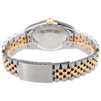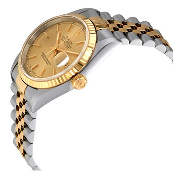 Silver-tone stainless steel case with a two-tone (silver-tone and gold-tone) yellow gold/stainless steel jubilee bracelet. Fixed fluted yellow gold 18kt yellow gold bezel. Champagne dial with gold-tone hands and index hour markers. Minute markers around the outer rim. Dial Type: Analog. Luminescent hands and markers. Date display at the 3 o'clock position. Rolex Calibre 3135 Automatic movement, containing 31 Jewels, bitting at 28800 vph, and has a power reserve of approximately 48 hours. Scratch resistant synthetic sapphire crystal. Screw down crown. Solid case back. Round case shape, case size: 36mm. Water resistant at 100 meters / 330 feet. Functions: date, hour, minute, second. Additional Info: date displays at 3 o'clock position. Datejust 36 Series. Luxury watch style. Watch label: Swiss Made. Pre-owned Rolex Oyster Perpetual Datejust Two-Tone 18kt Gold and Steel Men's Watch 16233J.