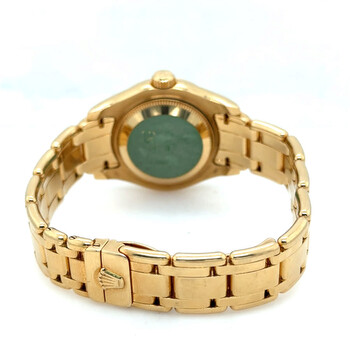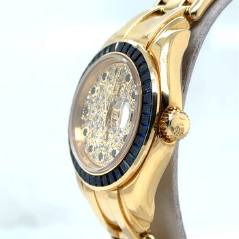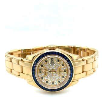 Yellow gold-tone 18kt yellow gold case with a yellow gold-tone 18kt yellow gold pearlmaster bracelet. Fixed blue sapphire set 18kt yellow gold bezel. Diamond dial with yellow gold-tone hands and diamond hour markers. Dial Type: Analog. Date display at the 3 o'clock position. Automatic movement. Scratch resistant sapphire crystal. Screw down crown. Solid case back. Round case shape, case size: 29 mm, case thickness: 10 mm. Band width: 14 mm. Crown clasp. Water resistant at 100 meters / 330 feet. Functions: date, hour, minute, second. Pearlmaster Series. Luxury watch style. Watch label: Swiss Made. Pre-owned Rolex Pearlmaster Automatic Diamond Ladies Watch 69308.
