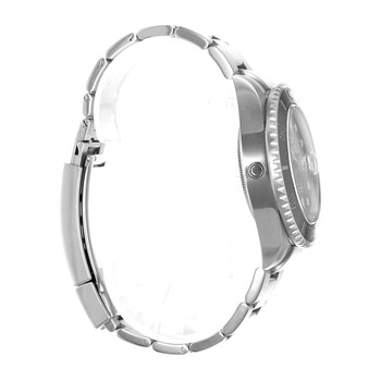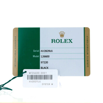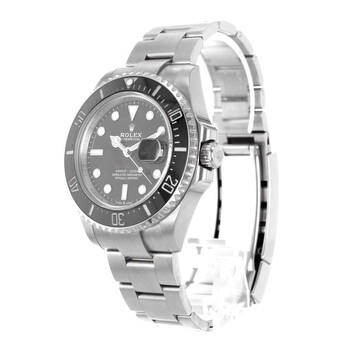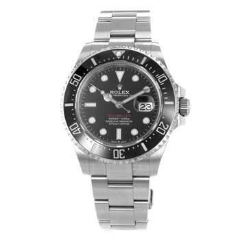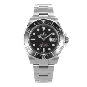 Silver-tone stainless steel case with a silver-tone stainless steel oyster bracelet. Uni-directional rotating black ceramic bezel. Black dial with silver-tone hands and index hour markers. Minute markers around the outer rim. Dial Type: Analog. Luminescent hands and markers. Date display at the 3 o'clock position. Rolex Calibre 3235 Automatic movement, based upon Rolex 3035, containing 31 Jewels, bitting at 28800 vph, and has a power reserve of approximately 70 hours. Scratch resistant sapphire crystal. Screw down crown. Solid case back. Round case shape, case size: 43 mm. Fold over clasp with a safety release. Water resistant at 1200 meters / 4000 feet. Functions: date, hour, minute, second, chronometer. Sea-dweller Series. Luxury watch style. Watch label: Swiss Made. Item Variations: 126600-0001. Pre-owned Rolex Sea-Dweller Automatic Chronometer Black Dial Men's Watch 126600 BKSO.