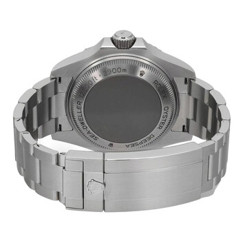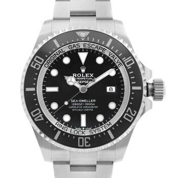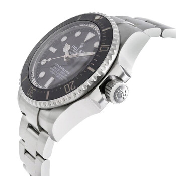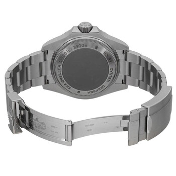 Silver-tone stainless steel case with a silver-tone stainless steel oyster bracelet. Uni-directional rotating black ceramic bezel. Black dial with silver-tone hands and index hour markers. Minute markers around the outer rim. Dial Type: Analog. Luminescent hands and markers. Date display at the 3 o'clock position. Rolex Calibre 3235 Automatic movement, based upon Rolex 3035, containing 31 Jewels, bitting at 28800 vph, and has a power reserve of approximately 70 hours. Scratch resistant sapphire crystal. Screw down crown. Solid case back. Round case shape, case size: 44 mm, case thickness: 18 mm. Band width: 17 mm, band length: 7.5 inches. Fold over clasp. Water resistant at 2000 meters / 6600 feet. Functions: date, hour, minute, second, chronometer. Sea-dweller Series. Dive watch style. Watch label: Swiss Made. Item Variations: M126660-0002. Pre-owned Rolex Sea-Dweller Automatic Chronometer Black Dial Men's Watch 126660 BKSO.