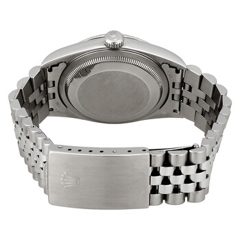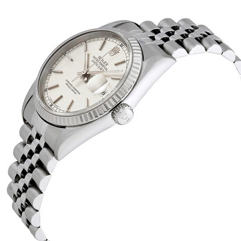 Silver-tone stainless steel case with a silver-tone stainless steel jubilee bracelet. Fixed fluted silver-tone stainless steel bezel. Silver dial with silver-tone hands and luminous stick hour markers. Minute markers around the outer rim. Dial Type: Analog. Luminescent hands and markers. Date display at the 3 o'clock position. Rolex Calibre 3135 Automatic movement, containing 31 Jewels, bitting at 28800 vph, and has a power reserve of approximately 48 hours. Scratch resistant sapphire crystal. Screw down crown. Solid case back. Round case shape, case size: 36 mm. Fold over clasp. Water resistant at 100 meters / 330 feet. Functions: hours, minutes, seconds, date. Datejust Series. Luxury watch style. Watch label: Swiss Made. Pre-owned Rolex Silver Dial Stainless Steel Jubilee Bracelet Men's Watch 16234SSJ.