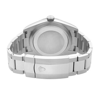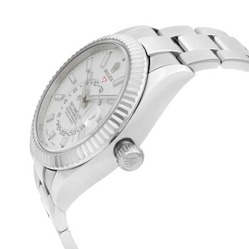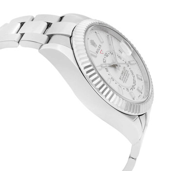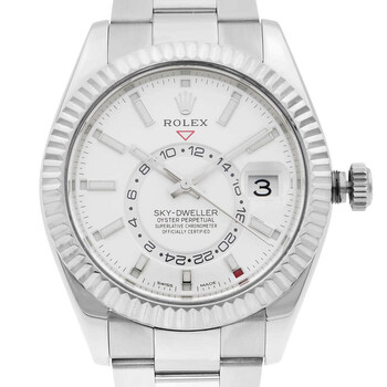 Silver-tone stainless steel case with a silver-tone stainless steel oyster bracelet. Fixed 18kt white gold bezel. White dial with silver-tone hands and index hour markers. Minute markers around the outer rim. Dial Type: Analog. Luminescent hands and markers. Date display at the 3 o'clock position. One subdial displaying: 24 hour. Rolex Calibre 9001 Automatic movement, containing 40 Jewels, composed of 380 parts, bitting at 28800 vph, and has a power reserve of approximately 72 hours. Scratch resistant sapphire crystal. Screw down crown. Solid case back. Round case shape, case size: 42 mm, case thickness: 14 mm. Band width: 17 mm, band length: 7 inches. Fold over clasp. Water resistant at 100 meters / 330 feet. Functions: annual calendar, month, date, GMT, second time zone, hour, minute, second, chronometer. Sky-dweller Series. Luxury watch style. Watch label: Swiss Made. Pre-owned Rolex Sky-Dweller GMT Automatic Chronometer White Dial Men's Watch 326934 WSO.