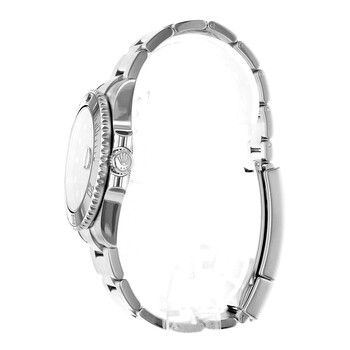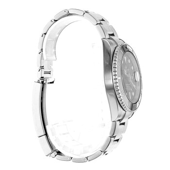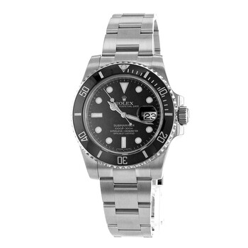 Silver-tone stainless steel case with a silver-tone stainless steel oyster bracelet. Uni-directional rotating black cerachrom bezel. Black dial with silver-tone hands and index hour markers. Minute markers around the outer rim. Dial Type: Analog. Luminescent hands and markers. Date display at the 3 o'clock position. Rolex Calibre 3135 Automatic movement, containing 31 Jewels, bitting at 28800 vph, and has a power reserve of approximately 48 hours. Scratch resistant sapphire crystal. Screw down crown. Solid case back. Round case shape, case size: 40 mm. Fold over clasp with a safety release. Water resistant at 300 meters / 1000 feet. Functions: date, hour, minute, second, chronometer. Submariner Series. Dive watch style. Watch label: Swiss Made. Pre-owned Rolex Submariner Automatic Chronometer Black Dial Men's Watch 116610 BKSO.