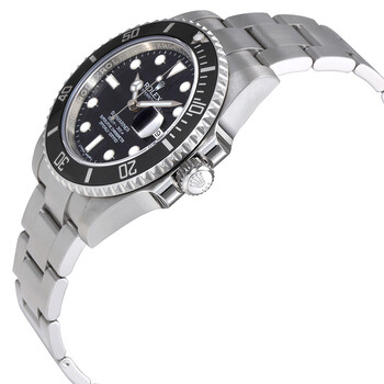 Silver-tone stainless steel case with a silver-tone stainless steel oyster bracelet. Uni-directional rotating black ceramic ceramic bezel. Black dial with luminous silver-tone hands and dot hour markers. Minute markers around the outer rim. Dial Type: Analog. Luminescent hands and hour markers. Date display at the 3 o'clock position. Rolex Calibre 3135 Automatic movement, containing 31 Jewels, bitting at 28800 vph, and has a power reserve of approximately 48 hours. Scratch resistant sapphire crystal. Screw down crown. Solid case back. Round case shape, case size: 40 mm, case thickness: 13 mm. Band width: 20 mm, band length: 7 1/4 inches. Deployment clasp. Water resistant at 300 meters / 1000 feet. Functions: date, hour, minute, second, chronometer. Submariner Series. Luxury watch style. Watch label: Swiss Made. Pre-owned Rolex Submariner Automatic Chronometer Black Dial Men's Watch 116610LN.