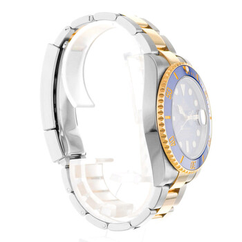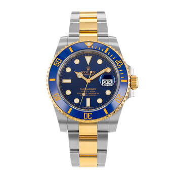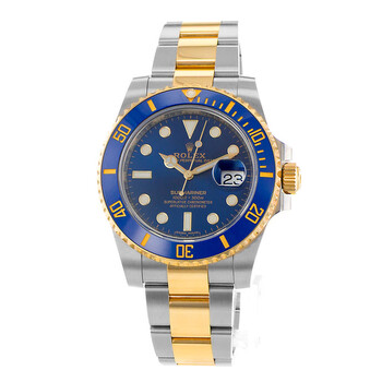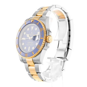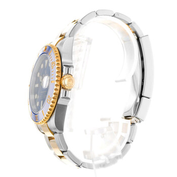 Silver-tone stainless steel case with a two-tone (silver-tone and yellow gold-tone) stainless steel and 18kt yellow gold bracelet. Uni-directional rotating blue 18kt yellow gold bezel. Blue dial with yellow gold-tone hands and index hour markers. Minute markers around the outer rim. Dial Type: Analog. Luminescent hands and markers. Date display at the 3 o'clock position. Rolex Calibre 3135 Automatic movement, containing 31 Jewels, bitting at 28800 vph, and has a power reserve of approximately 48 hours. Scratch resistant sapphire crystal. Screw down crown. Solid case back. Round case shape, case size: 40 mm. Fold over clasp with a safety release. Water resistant at 300 meters / 1000 feet. Functions: date, hour, minute, second, chronometer. Submariner Series. Dive watch style. Watch label: Swiss Made. Item Variations: 116613BLSO, 116613lb-0005. Pre-owned Rolex Submariner Automatic Chronometer Blue Dial Men's Watch 116613LB.