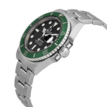 Pre-owned Stainless steel case with a stainless steel bracelet. Uni-directional rotating stainless steel bezel with a green ceramic ring. Black dial with luminous silver-tone hands and index hour markers. Minute markers around the outer rim. Dial Type: Analog. Luminescent hands and markers. Date display at the 3 o'clock position. Rolex calibre 3235 automatic movement, based upon Rolex 3035, containing 31 Jewels, bitting at 28800 vph, and has a power reserve of approximately 70 hours. Scratch resistant sapphire crystal. Screw down crown. Solid case back. Round case shape. Case size: 41 mm. Oysterlock clasp. Water resistant at 300 meters / 1000 feet. Functions: date, hour, minute, second, chronometer. Submariner Series. Luxury watch style. Watch label: Swiss Made. Item Variations: M126610LV-0002. Rolex Submariner "Kermit" Automatic Chronometer Black Dial Men's Watch 126610LVBKSO.