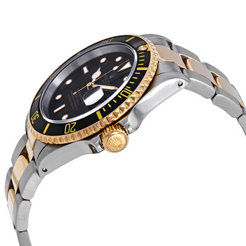 Silver-tone stainless steel case with a two-tone (silver-tone and gold-tone) 18kt yellow gold and stainless steel oyster bracelet. Uni-directional rotating black 18kt yellow gold and ceramic bezel. Black dial with gold-tone hands and index hour markers. Minute markers around the outer rim. Dial Type: Analog. Luminescent hands and markers. Date display at the 3 o'clock position. Rolex Calibre 3135 automatic movement with a 48-hour power reserve. Scratch resistant sapphire crystal. Screw down crown. Solid case back. Round case shape, case size: 40 mm, case thickness: 12.5 mm. Band width: 20 mm. Oysterlock clasp. Water resistant at 300 meters / 1000 feet. Functions: hours, minutes, seconds, date. Dive watch style. Watch label: Swiss Made. Pre-Owned Rolex Submariner Black Dial Two-Tone Men's Watch 16613BKSO.