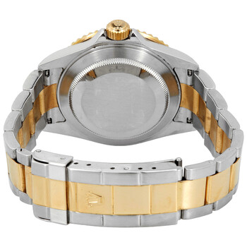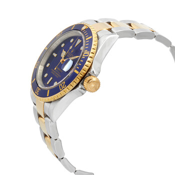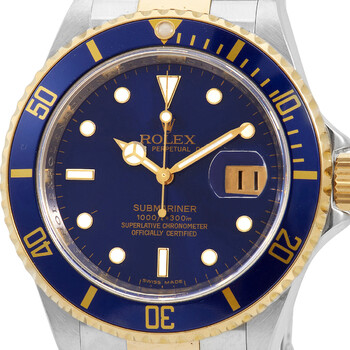 Silver-tone stainless steel case with a two-tone (silver-tone and gold-tone) 18 kt yellow gold and stainless steel bracelet. Uni-directional rotating blue 18kt yellow gold and ceramic bezel. Blue dial with gold-tone Mercedes-logo, sword, and Breguet-style shape hands and index hour markers. Minute markers around the outer rim. Dial Type: Analog. Luminescent hands and markers. Date display at the 3 o'clock position. Rolex Calibre 3135 automatic movement with a 48-hour power reserve. Scratch resistant sapphire crystal. Screw down crown. Solid case back. Round case shape. Case size: 40 mm. Oyster clasp. Water resistant at 300 meters / 1000 feet. Functions: date, hour, minute, second. Dive watch style. Watch label: Swiss Made. Pre-owned Rolex Submariner Blue Dial Two-Tone Men's Watch 16613BLSO.