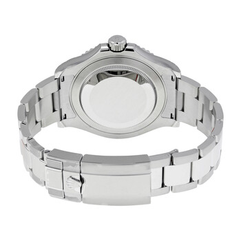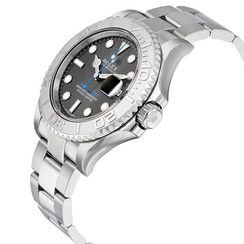 Silver-tone rolesium (combination steel and platinum) case with a silver-tone stainless steel rolex oyster bracelet. Bi-directional rotating time-lapse white platinum bezel. Dark rhodium dial with silver-tone hands and dot hour markers. Minute markers around the outer rim. Dial Type: Analog. Luminescent hands and markers. Date display at the 3 o'clock position. Rolex Calibre 3135 Automatic movement, containing 31 Jewels, bitting at 28800 vph, and has a power reserve of approximately 48 hours. Scratch resistant sapphire crystal. Screw down crown. Solid case back. Round case shape, case size: 40 mm. Band length: 6 3/4 inches. Oysterlock clasp. Water resistant at 100 meters / 330 feet. Functions: date, hour, minute, second, chronometer. Yacht-master Series. Luxury watch style. Watch label: Swiss Made. Pre-owned Rolex Yacht-Master 40 Dark Rhodium Dial Steel Oyster Men's Watch 116622RSO.