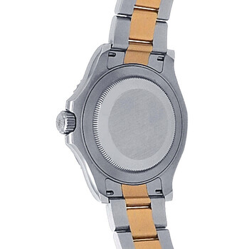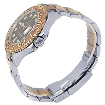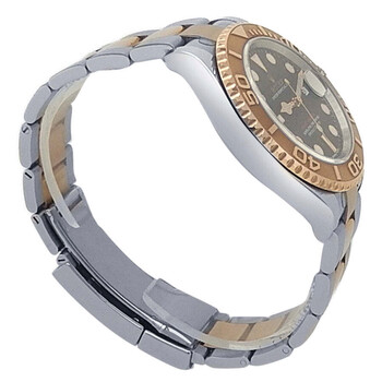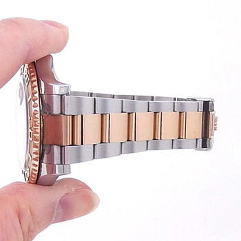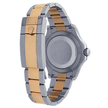 Silver-tone stainless steel case with a two-tone (silver-tone and rose gold-tone) 18kt rose gold and stainless steel oyster bracelet. Bi-directional rotating rose gold-tone 18kt rose gold bezel. Black dial with rose gold-tone hands and index hour markers. Minute markers around the outer rim. Dial Type: Analog. Luminescent hands and markers. Date display at the 3 o'clock position. Rolex Calibre 3135 Automatic movement, containing 31 Jewels, bitting at 28800 vph, and has a power reserve of approximately 48 hours. Scratch resistant sapphire crystal. Screw down crown. Solid case back. Round case shape, case size: 40 mm. Fold over clasp with a safety release. Water resistant at 100 meters / 330 feet. Functions: date, hour, minute, second, chronometer. Yacht-master Series. Dress watch style. Watch label: Swiss Made. Pre-owned Rolex Yacht-Master Automatic Chronometer Black Dial Men's Watch 116621 BKSO.
