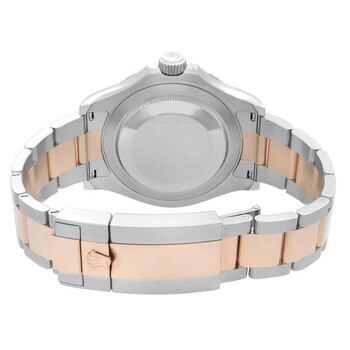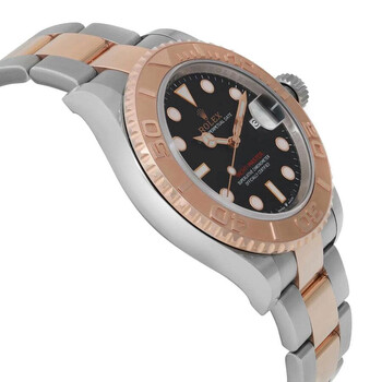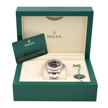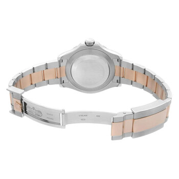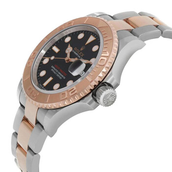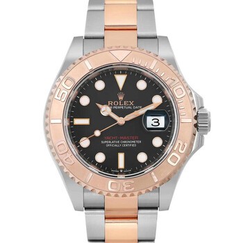 Silver-tone stainless steel case with a two-tone (silver-tone and rose gold-tone) 18kt rose gold and stainless steel oyster bracelet. Bi-directional rotating rose gold-tone 18kt rose gold bezel. Black dial with rose gold-tone hands and index hour markers. Minute markers around the outer rim. Dial Type: Analog. Luminescent hands and markers. Date subdials. Rolex Calibre 3235 Automatic movement, based upon Rolex 3035, containing 31 Jewels, bitting at 28800 vph, and has a power reserve of approximately 70 hours. Scratch resistant sapphire crystal. Screw down crown. Solid case back. Round case shape, case size: 40 mm, case thickness: 12 mm. Band width: 15.5 mm, band length: 7.5 inches. Fold over clasp. Water resistant at 100 meters / 330 feet. Functions: date, hour, minute, second, chronometer. Yacht-master Series. Luxury watch style. Watch label: Swiss Made. Item Variations: 126621BKSO, 126621-0002. Pre-owned Rolex Yacht-Master Automatic Chronometer Black Dial Men's Watch 126621 BKSO.