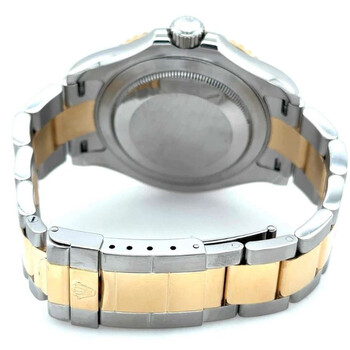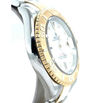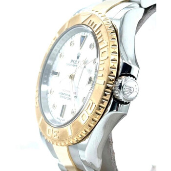 Pre-owned Silver-tone stainless steel case with a two-tone (silver-tone and yellow gold-tone) stainless steel and 18kt yellow gold rolex oyster bracelet. Bi-directional rotating time-lapse 18kt yellow gold bezel. Mother of pearl dial with yellow gold-tone Mercedes-logo, sword, and Breguet-style shape hands and diamond and sapphire hour markers. Minute markers around the outer rim. Dial Type: Analog. Luminescent hands and markers. Date display at the 3 o'clock position. Rolex Calibre 3135 automatic movement with a 50-hour power reserve. Scratch resistant sapphire crystal. Screw down crown. Solid case back. Round case shape. Case size: 40 mm. Oysterlock clasp. Water resistant at 100 meters / 330 feet. Functions: date, hour, minute, second, chronometer. Luxury watch style. Watch label: Swiss Made. Rolex Yacht-Master Mother of Pearl Dial Stainless steel and 18K Yellow Gold Oyster Bracelet Automatic Men's Watch 16623MDSO.