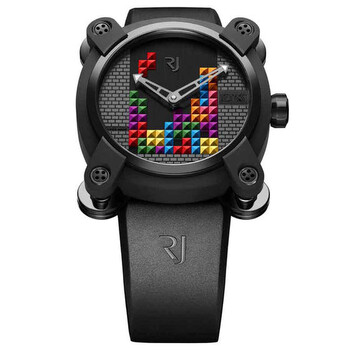 Black titanium case with a black rubber strap. Fixed black titanium bezel. Tetris dial with silver-tone arrow-shaped hands. Dial Type: Analog. Luminescent hands. Romain Jerome Caliber RJ001-A Automatic movement, containing 23 Jewels, bitting at 28800 vph, and has a power reserve of approximately 42 hours. Scratch resistant sapphire crystal. Round case shape, case size: 46 mm. Buckle clasp. Water resistant at 30 meters / 100 feet. Functions: hour, minute. Additional Info: limited edition of 84 pieces. Tetris-dna Series. Sport watch style. Watch label: Swiss Made. Pre-owned Romain Jerome Tetris-DNA Automatic Men's Watch RJ.M.AU.IN.010.01.