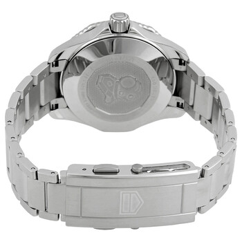 Silver-tone stainless steel case and bracelet. Uni-directional rotating silver-tone stainless steel with a black ceramic ring bezel. Silver-lacquered dial with luminous silver-tone hands and dot hour markers. Minute markers around the outer rim. Dial Type: Analog. Luminescent hands and markers. Date display at the 6 o'clock position. TAG Heuer Calibre 5 Automatic movement, based upon ETA 2824-2, containing 26 Jewels, bitting at 28800 vph, and has a power reserve of approximately 38 hours. Scratch resistant sapphire crystal. Screw down crown. Solid case back. Dodecagon case shape, case size: 36 mm. Fold over clasp with a push button release. Water resistant at 300 meters / 1000 feet. Functions: date, hour, minute, second. Aquaracer Series. Dive watch style. Watch label: Swiss Made. Pre-owned Tag Heuer Aquaracer Automatic Ladies Watch WBP231C.BA0626.
