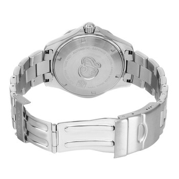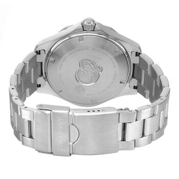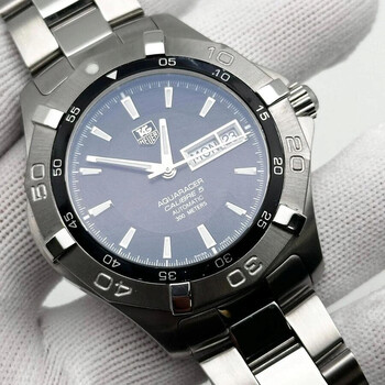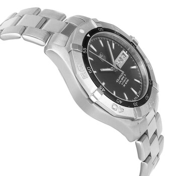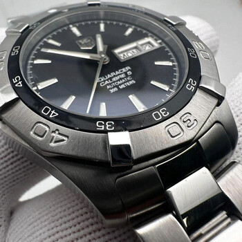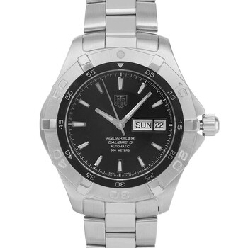 Pre-owned Stainless steel case with a stainless steel link bracelet. Unidirectional rotating stainless steel bezel. Black dial with silver-tone hands and stick hour markers. Minute markers around the outer rim. Luminescent hands and markers. Day and date display at the 3 o'clock position. Automatic movement. Scratch resistant sapphire crystal. Screw down crown. Screw down solid case back. Case diameter: 41 mm. Case thickness: 11 mm. Deployment clasp. Water resistant at 300 meters / 1000 feet. Tag Heuer Aquaracer Men's Watch WAF2010.BA0818.
