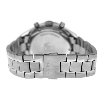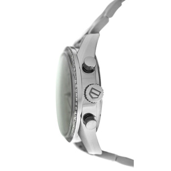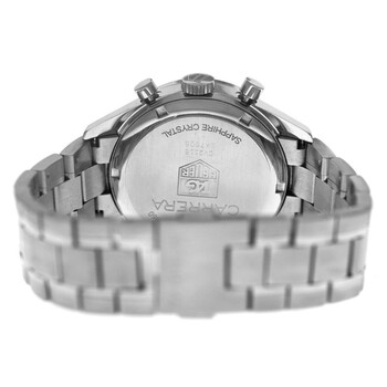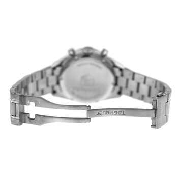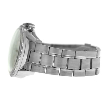 Silver-tone stainless steel case and bracelet. Fixed silver-tone bezel with diamond set stainless steel. White dial with silver-tone hands and Arabic numeral & index hour markers. Minute markers around the outer rim. Dial Type: Analog. Luminescent hands and markers. Date display at the 6 o'clock position. Chronograph - two sub-dials displaying: 60 second and 30 minute. Automatic movement. Scratch resistant sapphire crystal. Solid case back. Round case shape, case size: 38 mm. Fold over clasp with a safety release. Water resistant at 30 meters / 100 feet. Functions: chronograph, date, hour, minute, second. Carrera Series. Luxury watch style. Watch label: Swiss Made. Pre-owned Tag Heuer Carrera Chronograph Automatic Diamond White Dial Unisex Watch CV2116.