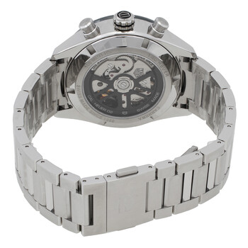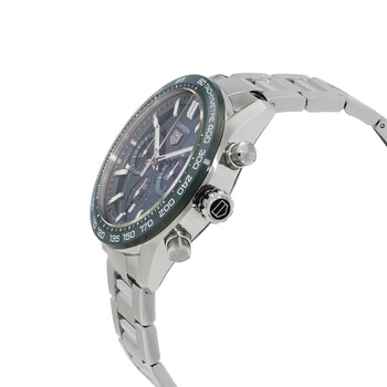 Silver-tone stainless steel case and bracelet. Fixed tachymeter scale green bezel. Green dial with silver-tone hands and index hour markers. Minute markers around the outer rim. Dial Type: Analog. Luminescent hands and markers. Date display at the 6 o'clock position. Chronograph - three sub-dials displaying: 60 second, 30 minute and 12 hour. Tag Heuer Calibre 02 Automatic movement, containing 33 Jewels, composed of 168 parts, bitting at 28800 vph, and has a power reserve of approximately 80 hours. Scratch resistant sapphire crystal. Transparent see through case back. Round case shape, case size: 44 mm. Deployment with push button release clasp. Water resistant at 100 meters / 330 feet. Functions: chronograph, column wheel, date, hour, minute, small second. Additional Info: original box, manual. Carrera Series. Luxury watch style. Watch label: Swiss Made. Pre-owned Tag Heuer Carrera Chronograph Automatic Green Dial Unisex Watch CBN2A1N-BA0643.