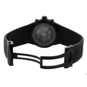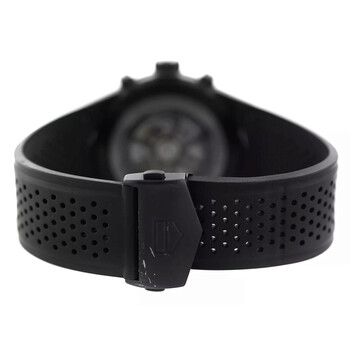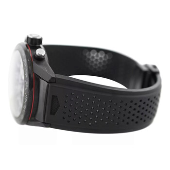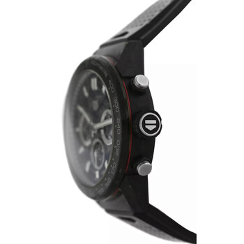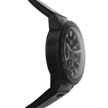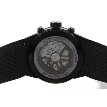 Pre-owned Carbon fiber case with a black rubber strap. Fixed tachymeter scale black bezel. Skeleton dial with silver-tone hands and index hour markers. Minute markers around the outer rim. Dial Type: Analog. Luminescent hands and markers. Date display between 4 and 5 o'clock position. Chronograph - three sub-dials displaying: 60 second, 30 minute and 12 hour. Tag Heuer Calibre 02 Automatic movement, containing 33 Jewels, composed of 168 parts, bitting at 28800 vph, and has a power reserve of approximately 80 hours. Scratch resistant sapphire crystal. Pull / push crown. Transparent case back. Round case shape, case size: 45 mm. Push button deployant buckle clasp. Water resistant at 100 meters / 330 feet. Functions: chronograph, column wheel, date, hour, minute, small second. Carrera Series. Luxury watch style. Watch label: Swiss Made. Tag Heuer Carrera Chronograph Automatic Men's Watch CBG2A91.FT6173.