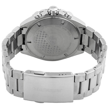Silver-tone stainless steel case with a silver-tone stainless steel with black ceramic center links bracelet. Fixed silver-tone stainless steel with a black ceramic top ring showing tachymeter markings bezel. Anthracite grey with sunray effect dial with luminous silver-tone hands and luminous index hour markers. Arabic numeral appears at the 12 o'clock position. Minute markers around the outer rim. Dial Type: Analog. Luminescent hands and markers. Date display at the 4 o'clock position. Chronograph - three sub-dials displaying: 60 second, 30 minute and 1/10th of a second. Quartz movement. Scratch resistant sapphire crystal. Screw down crown. Solid case back. Round case shape, case size: 43 mm, case thickness: 12 mm. Band width: 21 mm, band length: 7 3/4 inches. Deployment clasp. Water resistant at 200 meters / 660 feet. Functions: chronograph, tachymeter, hour, minute, second. Additional Info: in general, suitable for professional marine activity and serious surface water sports, but not diving. Formula 1 Series. Dress watch style. Watch label: Swiss Made. Pre-owned Tag Heuer Formula 1 Chronograph Quartz Men's Watch CAZ1011.BA0843.
