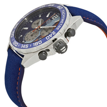 Silver-tone stainless steel case with a blue (calfskin) leather with asphalt texture strap. Fixed silver-tone stainless steel with a blue aluminium ring bezel. Blue/aqua/orange dial with luminous silver-tone hands and index hour markers. Arabic numeral appears at the 12 o'clock position. Minute markers around the outer rim. Dial Type: Analog. Luminescent hands and markers. Date display at the 4 o'clock position. Chronograph - three sub-dials displaying: 60 second, 30 minute and 1/10th of a second. Quartz movement. Scratch resistant sapphire crystal. Screw down crown. Solid case back. Round case shape, case size: 43 mm. Band length: 7 inches. Tang clasp. Water resistant at 200 meters / 660 feet. Functions: chronograph, date, hour, minute, second. Formula 1 Gulf Special Edition Series. Sport watch style. Watch label: Swiss Made. Pre-owned Tag Heuer Formula 1 Gulf Special Edition Chronograph Blue/Aqua/Orange Dial Men's Watch CAZ101N.FC8243.