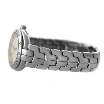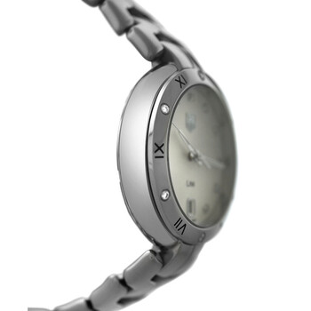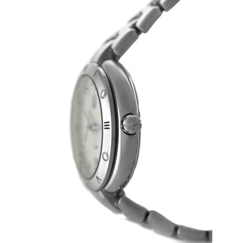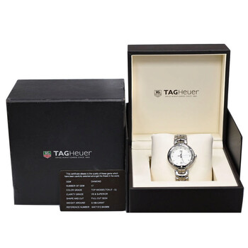 Silver-tone stainless steel case and bracelet. Fixed silver-tone stainless steel bezel. White dial with silver-tone hands and diamond hour markers. Dial Type: Analog. Date display at the 6 o'clock position. Quartz movement. Scratch resistant sapphire crystal. Screw down crown. Solid case back. Round case shape, case size: 34 mm. Band length: 7.5 inches. Fold over clasp with a safety release. Water resistant at 100 meters / 330 feet. Functions: date, hour, minute, second. Link Series. Luxury watch style. Watch label: Swiss Made. Item Variations: WAT1312, WAT1312 BA0956, WAT1312-BA0956, WAT1312/BA0956, WAT1312BA0956. Pre-owned Tag Heuer Link Quartz Diamond White Dial Ladies Watch WAT1312.BA0956.