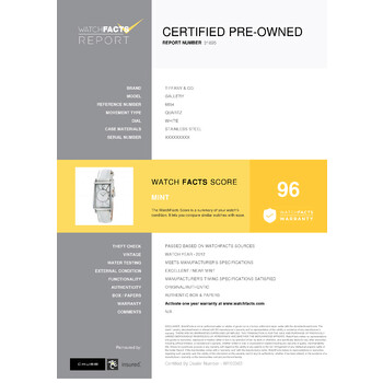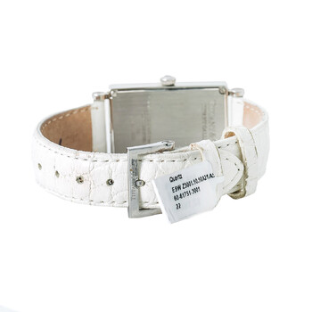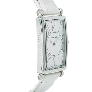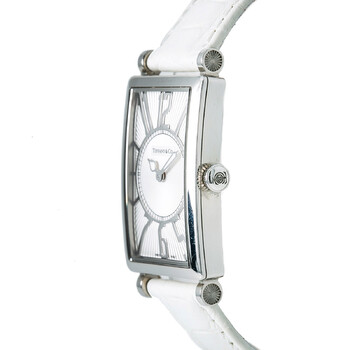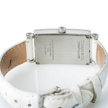 Silver-tone stainless steel case with a silver-tone leather strap. Fixed silver-tone stainless steel bezel. White dial with silver-tone hands and Arabic numeral hour markers. Minute scale around the inner rim. Dial Type: Analog. Luminescent hands. Quartz movement. Scratch resistant sapphire crystal. Solid case back. Rectangle case shape, case size: 23 mm, case thickness: 6 mm. Band width: 16 mm, band length: 6.5 inches. Buckle clasp. Water resistant at 30 meters / 100 feet. Functions: hour, minute. Luxury watch style. Watch label: Swiss Made. Pre-owned Tiffany Gallery White Dial Ladies Watch 6654.