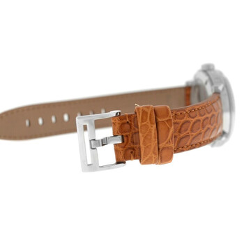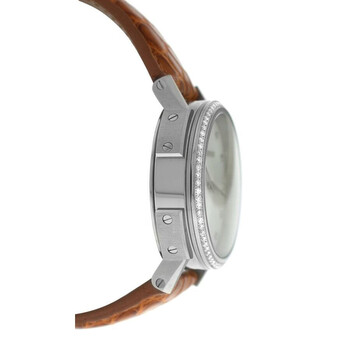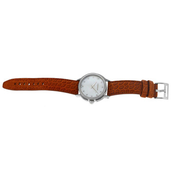 Silver-tone stainless steel case with a alligator band. Fixed silver-tone stainless steel bezel. Mother of pearl dial with silver-tone hands and diamond hour markers. Dial Type: Analog. Quartz movement. Solid case back. Round case shape, case size: 35 mm. Band length: 7 inches. Buckle clasp. Functions: hour, minute. Tny Roventa Series. Luxury watch style. Watch label: Swiss Made. Pre-owned Tourneau Tny Roventa Quartz Diamond Ladies Watch TNY350707.