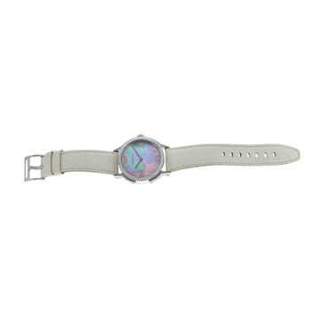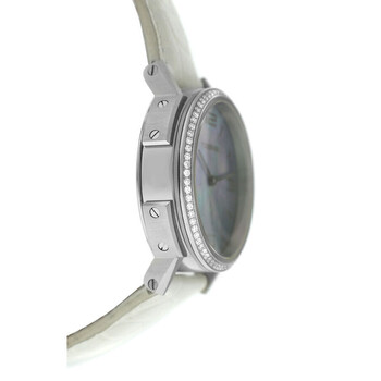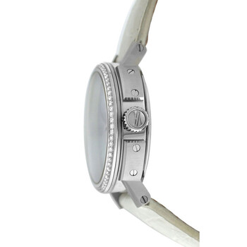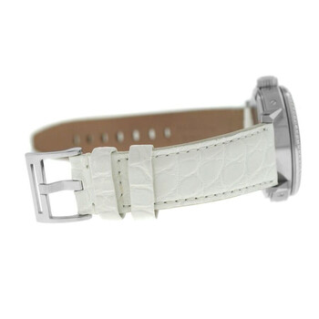 Silver-tone stainless steel case with a white alligator band. Fixed silver-tone bezel with diamond set stainless steel. Mother of pearl dial with black hands and Arabic numeral & index hour markers. Dial Type: Analog. Quartz movement. Solid case back. Round case shape, case size: 35 mm. Band length: 7 inches. Buckle clasp. Functions: hour, minute. Tny Roventa Series. Luxury watch style. Watch label: Swiss Made. Pre-owned Tourneau Tny Roventa Quartz Diamond Ladies Watch TNY350707009.