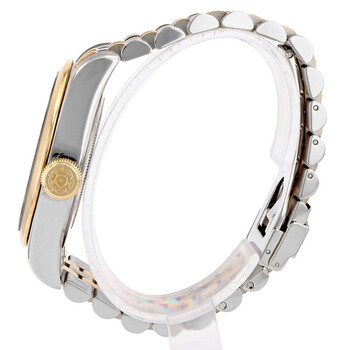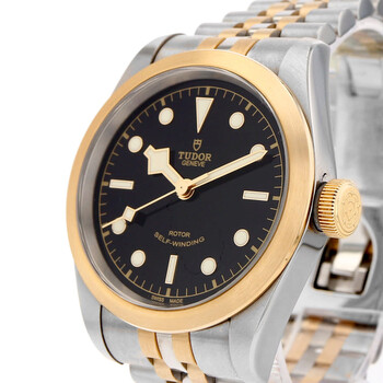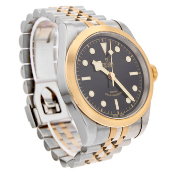 Silver-tone stainless steel case and bracelet. Fixed gold-tone stainless steel bezel. Black dial with gold-tone hands and index hour markers. Minute markers around the outer rim. Dial Type: Analog. Luminescent hands and markers. Automatic movement. Scratch resistant sapphire crystal. Round case shape, case size: 41 mm. Fold over clasp with a safety release. Functions: hour, minute, second. Black Bay Series. Luxury watch style. Watch label: Swiss Made. Pre-owned Tudor Black Bay Automatic Black Dial Men's Watch 79543-0001.