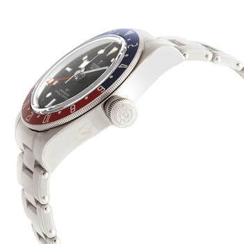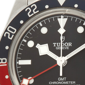 Silver-tone stainless steel case and bracelet. Bi-directional rotating coin edge stainless steel with a red and blue (pepsi) GMT aluminium ring bezel. Black dial with luminous silver-tone snowflake hands and dot hour markers. Minute markers around the outer rim. Dial Type: Analog. Luminescent hands and markers. Date display at the 3 o'clock position. Tudor Calibre MT5652 Automatic movement, containing 26 Jewels, bitting at 28800 vph, and has a power reserve of approximately 70 hours. Scratch resistant sapphire crystal. Screw down crown. Solid case back. Round case shape, case size: 41 mm, case thickness: 14.5 mm. Band width: 22 mm. Fold over clasp. Water resistant at 200 meters / 660 feet. Functions: GMT, second time zone, hour, minute, second, date. Black Bay Series. Luxury watch style. Watch label: Swiss Made. Pre-owned Tudor Black Bay Automatic Black Dial Men's Watch M79830RB-0001.