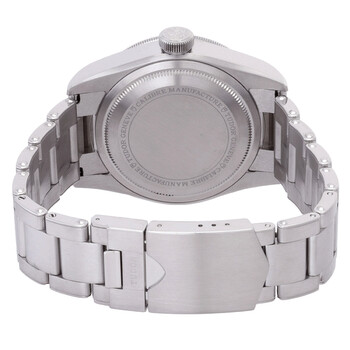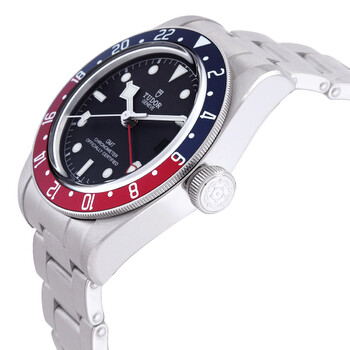 Silver-tone stainless steel case and bracelet. Bi-directional rotating pepsi stainless steel with an aluminium blue and red ring bezel. Black dial with silver-tone snowflake hands and index hour markers. Minute markers around the outer rim. Dial Type: Analog. Luminescent hands and markers. Date display at the 3 o'clock position. Tudor Calibre MT5652 Automatic movement, containing 26 Jewels, bitting at 28800 vph, and has a power reserve of approximately 70 hours. Scratch resistant sapphire crystal. Screw down crown. Solid case back. Round case shape, case size: 41 mm. Fold over clasp with a safety release. Water resistant at 200 meters / 660 feet. Functions: date, GMT, second time zone, hour, minute, second, chronometer. Black Bay Series. Luxury watch style. Watch label: Swiss Made. Pre-owned Tudor Black Bay GMT Automatic Chronometer Black Dial Pepsi Bezel Men's Watch M79830RB-0002.