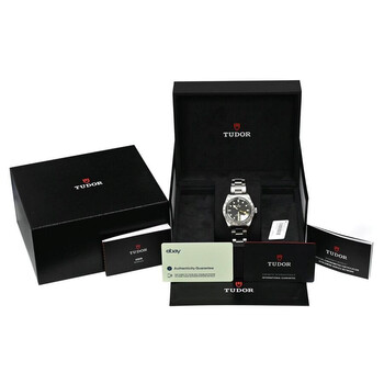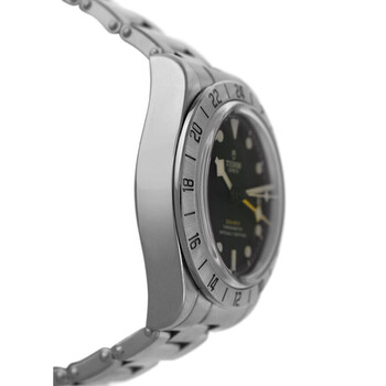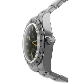 Silver-tone stainless steel case and bracelet. Fixed silver-tone stainless steel bezel. Black dial with silver-tone hands and Arabic numeral & index hour markers. Minute markers around the outer rim. Dial Type: Analog. Luminescent hands and markers. Date display at the 3 o'clock position. Automatic movement. Scratch resistant sapphire crystal. Screw down crown. Solid case back. Round case shape, case size: 39 mm. Band length: 7.5 inches. Fold over clasp with a safety release. Water resistant at 200 meters / 660 feet. Functions: date, hour, minute, second. Black Bay Pro Series. Luxury watch style. Watch label: Swiss Made. Item Variations: 79470, 79470-0001. Pre-owned Tudor Black Bay Pro Automatic Black Dial Men's Watch m79470-0001.