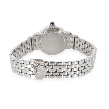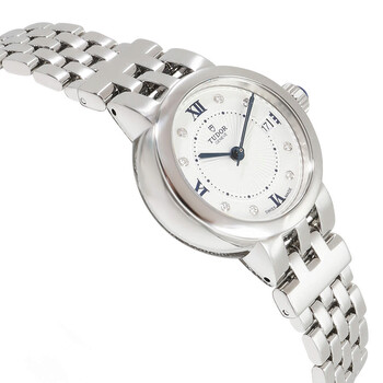 Silver-tone stainless steel case and bracelet. Fixed silver-tone stainless steel bezel. Silver-tone dial with blue hands and diamond hour markers. Minute scale around the inner rim. Dial Type: Analog. Date display at the 3 o'clock position. Automatic movement. Scratch resistant sapphire crystal. Solid case back. Round case shape, case size: 26 mm, case thickness: 10.30 mm. Band width: 13 mm, band length: 7.00 inches. Fold over clasp with a safety release. Functions: date, hour, minute, second. Additional Info: includes box, instructions. Claire De Rose Series. Sport watch style. Watch label: Swiss Made. Pre-owned Tudor Claire De Rose Automatic Diamond Silver Dial Ladies Watch 35200.