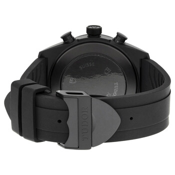 Black ceramic case with a black rubber strap. Fixed black ceramic bezel. Black dial with index hour markers. Minute markers around the outer rim. Dial Type: Analog. Luminescent hands and markers. Date display between 4 and 5 o'clock position. Chronograph - three sub-dials displaying: 60 second, 30 minute and 12 hour. ETA-Valjoux Caliber 7753 automatic movement with a 44-hour power reserve. Scratch resistant sapphire crystal. Screw down crown. Solid case back. Round case shape, case size: 42 mm, case thickness: 15 mm. Band length: 8 inches. Tang clasp. Water resistant at 150 meters / 500 feet. Functions: chronograph, date, hour, minute, second. Luxury watch style. Watch label: Swiss Made. Pre-owned Tudor Fastrider Chronograph Automatic Black Dial Men's Watch 42000C.