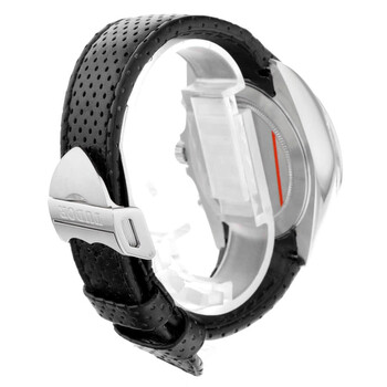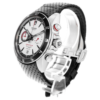 Silver-tone stainless steel case with a black leather strap. Fixed black stainless steel bezel. White dial with black hands and index hour markers. Dial Type: Analog. Luminescent hands and markers. Date display at the 6 o'clock position. Chronograph - two sub-dials displaying: 60 second and 45 minute. Tudor Calibre 2892 Chronograph Automatic movement, based upon ETA 2892, containing 21 Jewels, bitting at 28800 vph, and has a power reserve of approximately 42 hours. Scratch resistant sapphire crystal. Screw down crown. Solid case back. Round case shape, case size: 42 mm. Deployment with push button release clasp. Water resistant at 150 meters / 500 feet. Functions: chronograph, flyback, date, hour, minute, second. Grantour Chrono Fly-back Series. Luxury watch style. Watch label: Swiss Made. Pre-owned Tudor Grantour Chrono Fly-Back Chronograph Automatic White Dial Men's Watch 20550N.