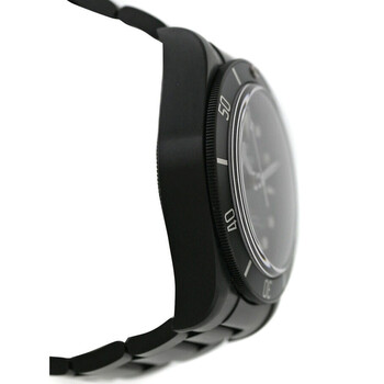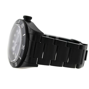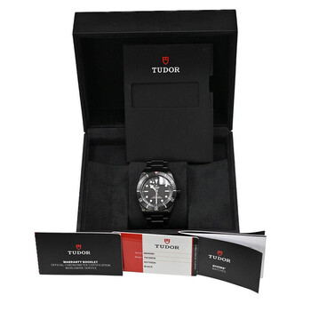 Black stainless steel case and bracelet. Uni-directional rotating black stainless steel bezel. Black dial with silver-tone hands and Arabic numeral & index hour markers. Minute markers around the outer rim. Dial Type: Analog. Luminescent hands and markers. Tudor Calibre MT5602 Automatic movement, based upon Tudor MT5612, containing 26 Jewels, bitting at 28800 vph, and has a power reserve of approximately 70 hours. Scratch resistant sapphire crystal. Screw down crown. Solid case back. Round case shape, case size: 41 mm. Fold over clasp with a safety release. Water resistant at 200 meters / 660 feet. Functions: hour, minute, second, chronometer. Heritage Black Bay Dark Series. Casual watch style. Watch label: Swiss Made. Item Variations: 79230DK-0008. Pre-owned Tudor Heritage Black Bay Dark Automatic Chronometer Black Dial Men's Watch 79230DK.