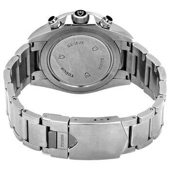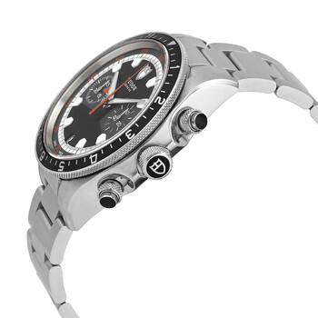 Silver-tone stainless steel case and bracelet. Bi-directional rotating silver-tone stainless steel with a black aluminium ring bezel. Black dial with luminous silver-tone hands and index hour markers. Minute markers. Arabic numeral minute markers (at 5 minute intervals) around the outer rim. Dial Type: Analog. Luminescent hands and markers. Date display at the 6 o'clock position. Chronograph - two sub-dials displaying: seconds and 45 minutes. Tudor Calibre 2892 automatic movement with a 42-hour power reserve. Scratch resistant sapphire crystal. Screw down crown. Solid case back. Round case shape, case size: 42 mm. Band length: 7 1/2 inches. Fold over clasp with a safety release. Water resistant at 150 meters / 500 feet. Functions: chronograph, date, hour, minute, second. Heritage Series. Luxury watch style. Watch label: Swiss Made. Pre-owned Tudor Heritage Chronograph Automatic Black Dial Men's Watch M70330N-0005.