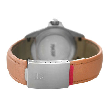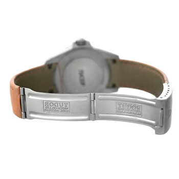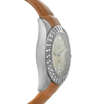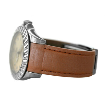 Silver-tone stainless steel case with a brown leather strap. Fixed silver-tone bezel with diamond set stainless steel. Beige dial with silver-tone hands and Arabic numeral & index hour markers. Minute markers around the outer rim. Dial Type: Analog. Date display at the 3 o'clock position. Automatic movement. Solid case back. Round case shape, case size: 39 mm. Band length: 7 inches. Fold over clasp with a safety release. Functions: date, hour, minute, second. Prince Date Series. Luxury watch style. Watch label: Swiss Made. Pre-owned Tudor Prince Date Automatic Diamond Ladies Watch 79430P.