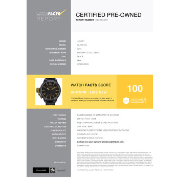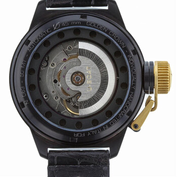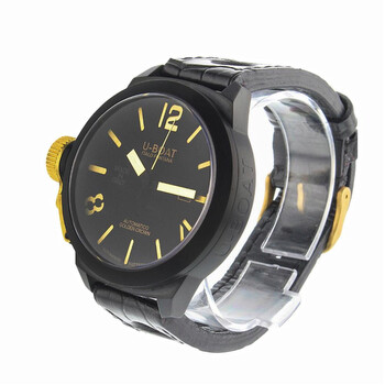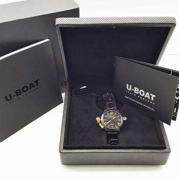 Black ceramic case with a black rubber strap. Fixed black ceramic bezel. Black with visiable ruby dial with gold-tone hands and stick hour markers. Arabic numerals mark the 4, 8 and 12 o'clock positions. Dial Type: Analog. Luminescent hands and markers. Date display at the 3 o'clock position. U-Boat Calibre U-28 automatic movement with a 40-hour power reserve. Scratch resistant anti-reflective sapphire crystal. Pull and push with 18kt gold screw down guard crown. Transparent case back. Round case shape, case size: 45 mm, case thickness: 14.5 mm. Band width: 20 mm, band length: 8 inches. Tang clasp. Water resistant at 50 meters / 165 feet. Functions: date, hour, minute, second. Luxury watch style. Watch label: Movimento Svizzero. Pre-owned U-Boat Classico Golden Crown Automatic Men's Watch 1216.