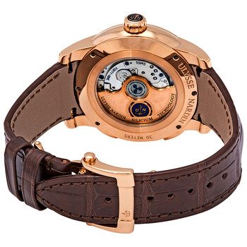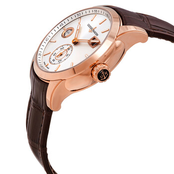 Pre-owned 18kt rose gold case with a brown (alligator) leather strap. Fixed 18kt rose gold bezel. Silver dial with luminous rose gold hands and index hour markers. Minute markers around the outer rim. Dial Type: Analog. Luminescent hands. Date display at the 1 o'clock position. Small seconds sub-dial. Second time zone display at the 9 o'clock position. Ulysse Nardin calibre UN-334 automatic movement, containing 49 Jewels, bitting at 28800 vph, and has a power reserve of approximately 48 hours. Scratch resistant sapphire crystal. Screw down crown. Transparent case back. Round case shape. Case size: 42 mm. Case thickness: 13.25 mm. Band width: 20 mm. Deployment clasp. Water resistant at 100 meters / 330 feet. Functions: GMT, second time zone, date, hour, minute, second. Luxury watch style. Watch label: Swiss Made. Ulysse Nardin Dual Time Silver Dial 18kt Rose Gold Men's Watch 3346-126-91.