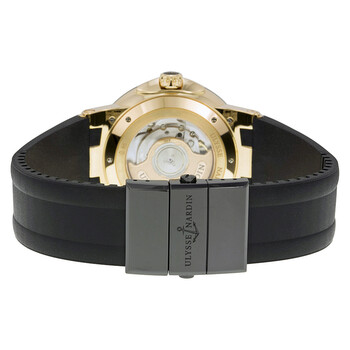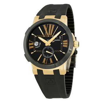 Pre-owned 18kt rose gold case with a black rubber strap. Fixed black ceramic bezel. Black dial with luminous gold hands and index hour markers. Roman numerals mark the 3, 6, 9 and 12 o'clock position. Minute markers around an inner ring. Dial Type: Analog. Luminescent hands and markers. Date display at the 2 o'clock position. Small seconds sub-dial at the 6 o'clock position. Dual time display at the 9 o'clock position. Ulysse Nardin calibre UN-24 automatic movement with a 42 hour power reserve. Scratch resistant sapphire crystal. Screw down crown. Transparent case back. Case diameter: 43 mm. Case thickness: 12.60 mm. Round case shape. Band width: 22 mm. Deployment clasp. Water resistant at 100 meters / 330 feet. Functions: date, hour, minute, second. Luxury watch style. Watch label: Swiss Made. Ulysse Nardin Executive Dual Time Black Dial 18kt Rose Gold Black Rubber Men's Watch 246-00-3-42.