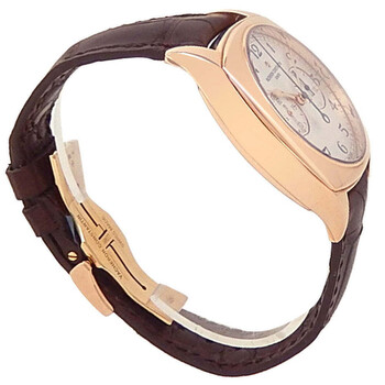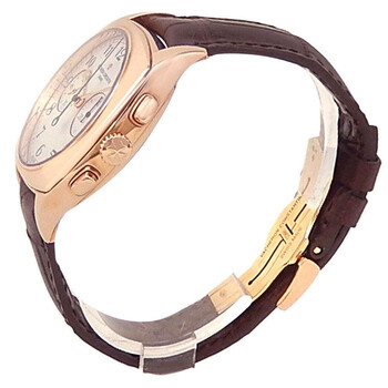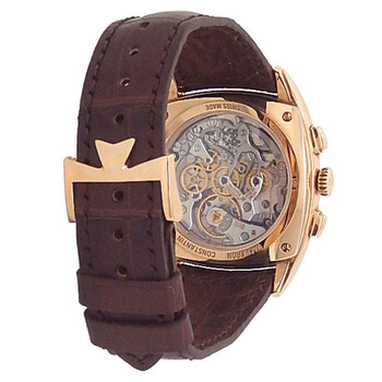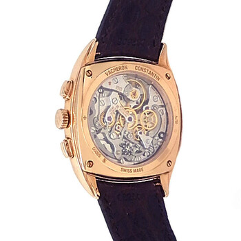 Pre-owned 18kt rose gold case with a dark brown leather strap. Fixed 18kt rose gold bezel. Silver dial with rose gold-tone hands and Arabic numeral hour markers. Dial Type: Analog. Chronograph - two sub-dials displaying: 60 second and 30 minute. Vacheron Constantin Calibre 1142 Hand Wind movement, based upon Vacheron Constantin 1141, containing 21 Jewels, composed of 164 parts, bitting at 21600 vph, and has a power reserve of approximately 48 hours. Scratch resistant sapphire crystal. Cushion case shape, case size: 37 mm x 46.60. Water resistant at 30 meters / 100 feet. Functions: chronograph, hour, minute, second. Harmony Series. Luxury watch style. Watch label: Swiss Made. Vacheron Constantin Harmony Men's Hand Wound Watch 5000S/000R-B139.