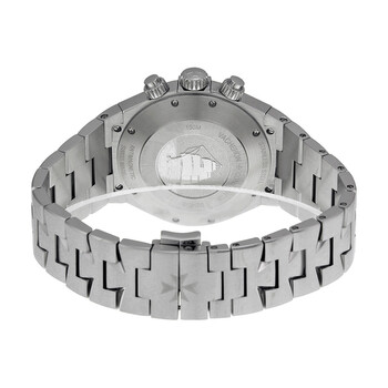 Pre-owned Stainless steel case with a stainless steel bracelet. Fixed stainless steel bezel. Silver dial with luminous black hands and index hour markers. Minute markers around the outer rim. Dial Type: Analog. Luminescent hands and markers. Date display at the 12 o'clock position. Chronograph - three sub-dials displaying: 60 second, 30 minute and 12 hour. Vacheron Constantin calibre 1137 automatic movement, containing 37 Jewels, bitting at 21600 vph, and has a power reserve of approximately 40 hours. Scratch resistant sapphire crystal. Screw down crown. Solid case back. Round case shape. Case size: 42 mm. Case thickness: 12.45 mm. Band width: 20.3 mm. Band length: 8 inches. Fold over clasp with a push button release. Water resistant at 150 meters / 500 feet. Functions: chronograph, column wheel, big date, hour, minute, small second. Overseas Series. Luxury watch style. Watch label: Swiss Made. Item Variations: 49150B01A-9095 , 49150/B01A-9095 , X49A6954. Vacheron Constantin Overseas Chronograph Men's Watch 49150/B01A-9095.