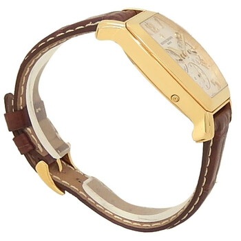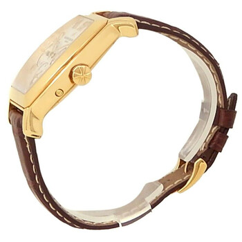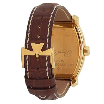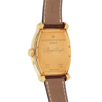 Yellow gold-tone 18kt yellow gold case with a brown genuine leather strap. Fixed yellow gold-tone 18kt yellow gold bezel. White dial with yellow gold-tone hands and Arabic numeral hour markers. Minute markers around the outer rim. Dial Type: Analog. Date display at the 3 o'clock position. Automatic movement. Scratch resistant sapphire crystal. Solid case back. Tonneau case shape, case size: 36 mm. Buckle clasp. Functions: date, day, hour, minute, second. Royal Eagle Series. Sport watch style. Watch label: Swiss Made. Pre-owned Vacheron Constantin Royal Eagle Automatic White Dial Men's Watch 42008/000J-9061.