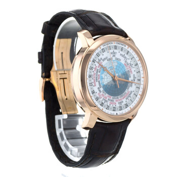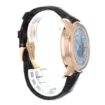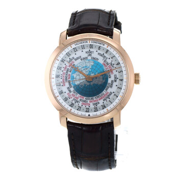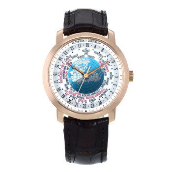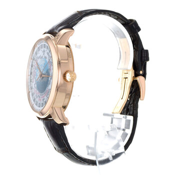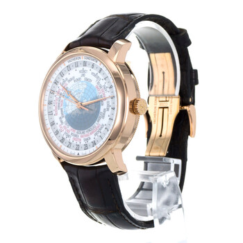 Rose gold-tone 18kt rose gold case with a leather strap. Fixed rose gold-tone 18kt rose gold bezel. Silver ("lambert projection" world map) dial with rose gold-tone hands and index hour markers. Rotating 24 hour (worldtime). Worldtime cities. Minute markers around the outer rim. Dial Type: Analog. Vacheron Constantin Calibre 2460 WT Automatic movement, containing 27 Jewels, composed of 255 parts, bitting at 28800 vph, and has a power reserve of approximately 40 hours. Scratch resistant sapphire crystal. Pull / push crown. Transparent case back. Round case shape, case size: 42.5 mm, case thickness: 11.62 mm. Deployment clasp. Water resistant at 30 meters / 100 feet. Functions: hour, minute, second, world time, day and night indicator, GMT. Traditionnelle Series. Travel watch style. Watch label: Swiss Made. Item Variations: 86060000R-9640 , 86060/000R-9640 , X86R4717. Pre-owned Vacheron Constantin Traditionnelle GMT Silver ("Lambert Projection" world map) Dial Men's Watch 86060/000R-9640.