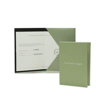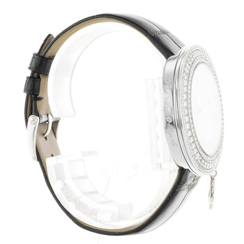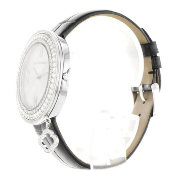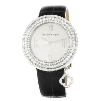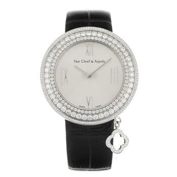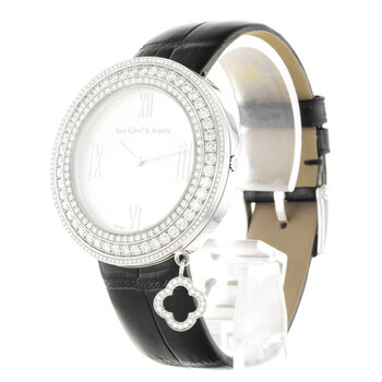 18kt white gold case with a black leather strap. Fixed bezel with diamond set 18kt white gold. Silver dial with silver-toned hands and Roman numeral hour markers. Dial Type: Analog. Quartz movement. Scratch resistant sapphire crystal. Solid case back. Round case shape, case size: 38 mm. Tang clasp. Functions: hour, minute. Charms Series. Luxury watch style. Watch label: Swiss Made. Pre-owned Van Cleef Arpels Charms Diamond Silver Dial Ladies Watch VCARM95400.