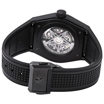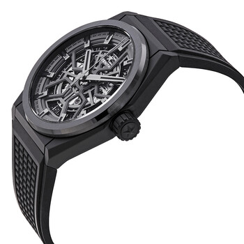 Pre-owned Black ceramic case with a black rubber strap. Fixed black ceramic bezel. Black skeleton dial with luminous black hands and index hour markers. Minute markers around the outer rim. Dial Type: Analog. Date display at the 6 o'clock position. Zenith calibre Elite 670 SK automatic movement, based upon Zenith Elite 670, containing 27 Jewels, composed of 187 parts, bitting at 28800 vph, and has a power reserve of approximately 50 hours. Scratch resistant sapphire crystal. Transparent case back. Round case shape. Case size: 41 mm. Case thickness: 9.45 mm. Double fold over clasp. Water resistant at 100 meters / 330 feet. Functions: date, hour, minute, second. Defy Classic Series. Luxury watch style. Watch label: Swiss Made. Zenith DEFY Classic Automatic Men's Watch 49.9000.670/77.R782.